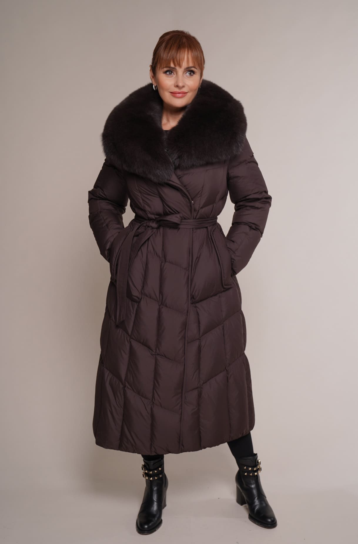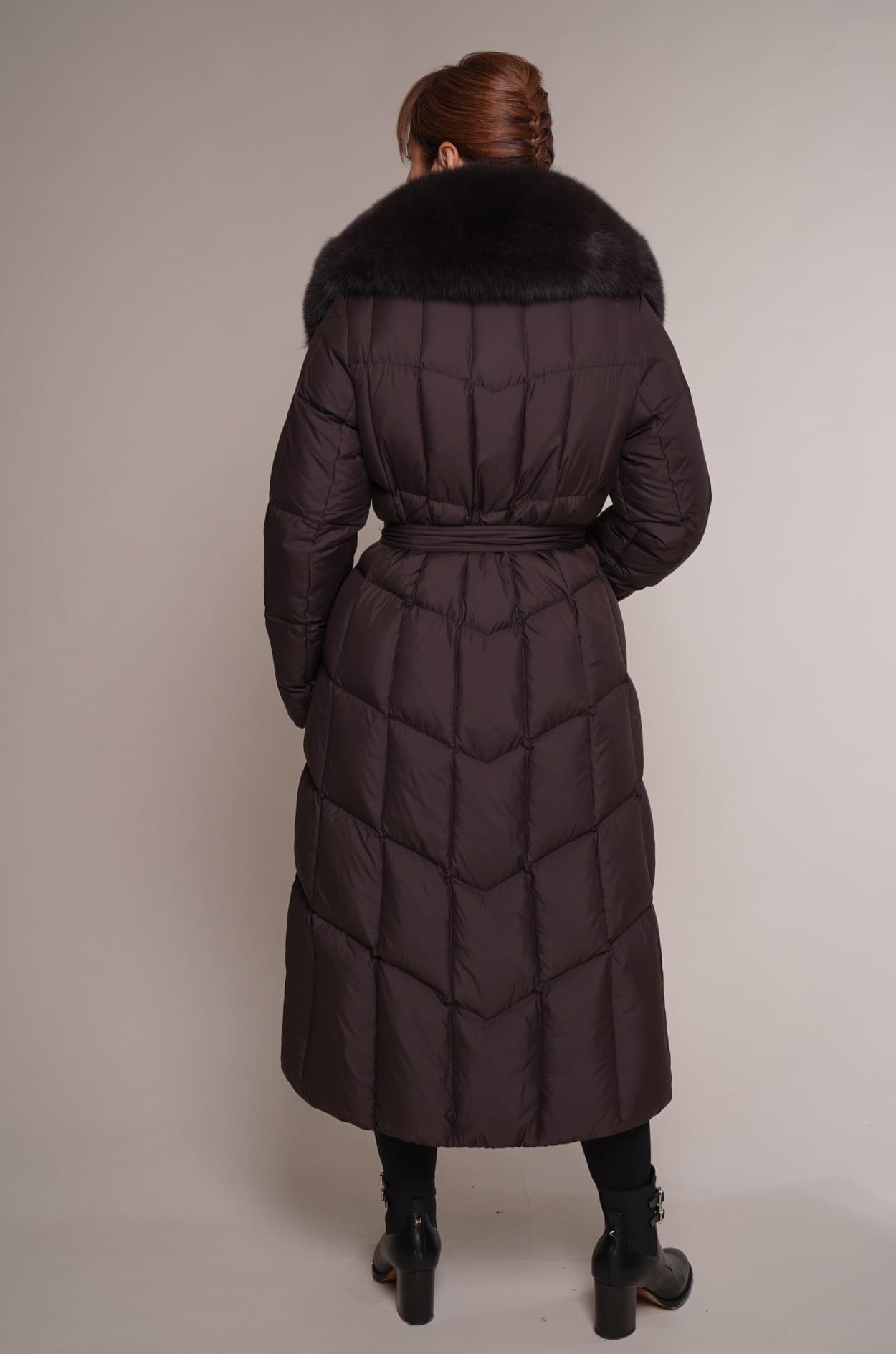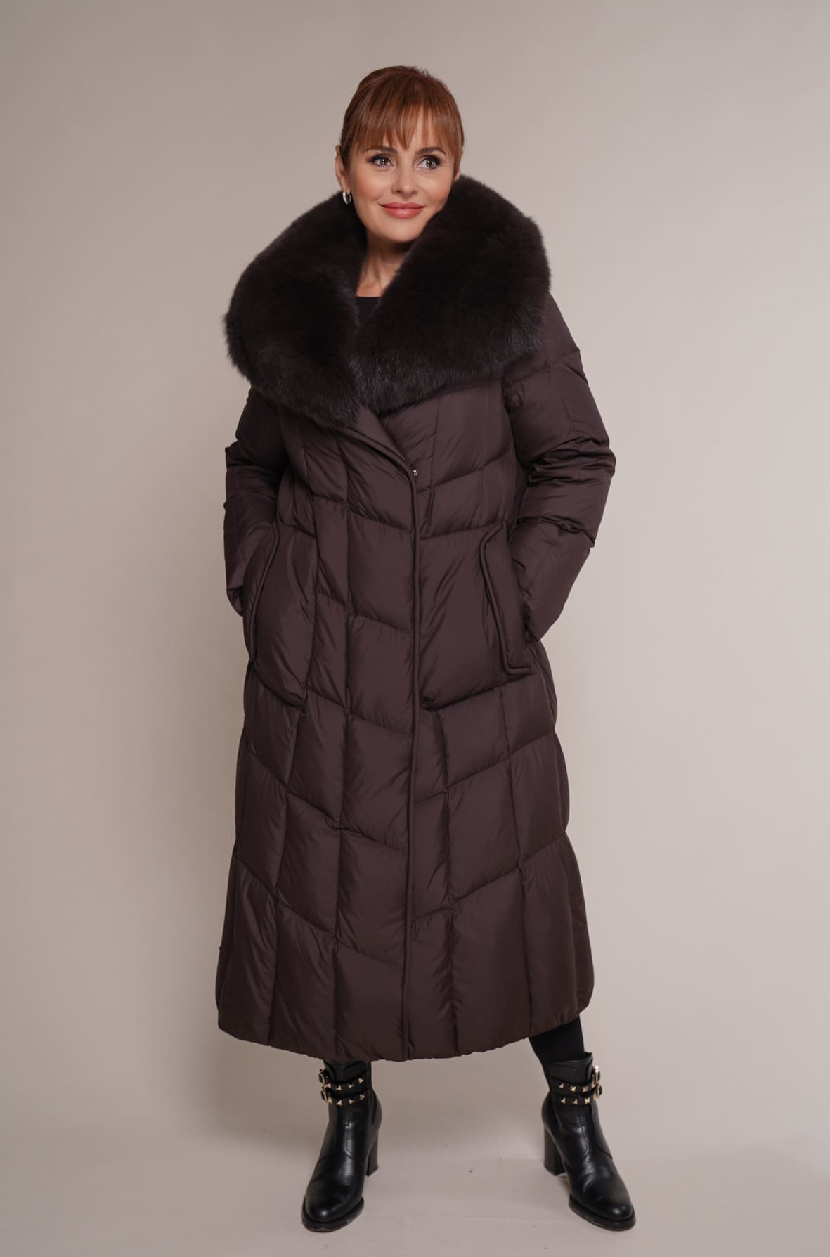 Schokoladenbraun | Reverskragen – Polarfuchs | 115 cm. | 2W. Reißverschluss | 2 Außentaschen